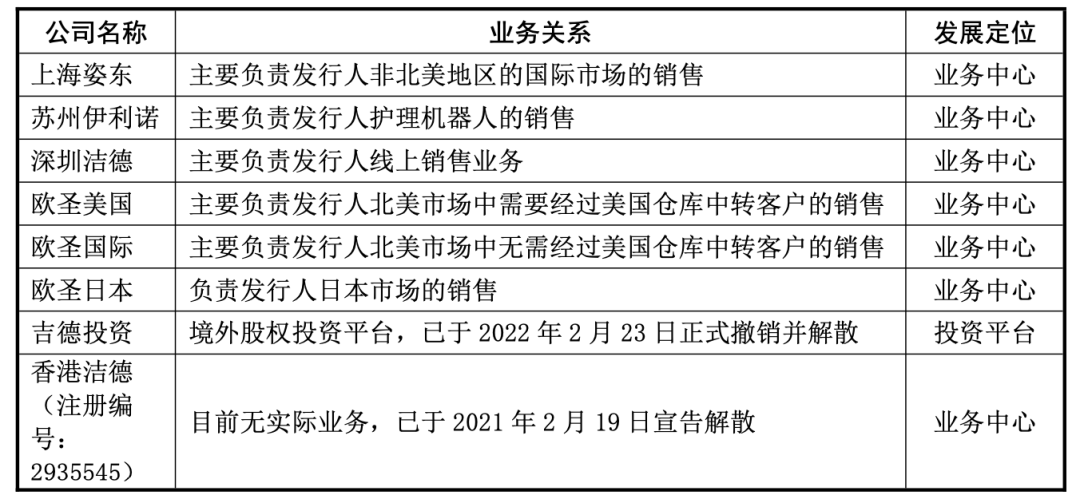 各子公司的业务关系、发展定位等情况如下所示。其中亚马逊平台的运营主要放在深圳洁德,其收入来源于另一家子公司欧圣美国支付的服务费。