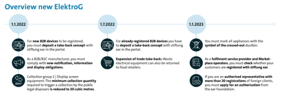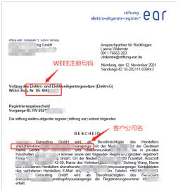 什么是德国WEEE 德国的电器与电子设备废料 (WEEE) 管理机构是 Stiftung EAR(EAR 基金会 - http://www.stiftung-ear.de) WEEE指的是报废电子电气设备回收指令,WEEE即Waste Electrical and Electronic Equipment(WEEE) Directive (2012/19/EU)。 指令的目的是预防电子废弃物的发生,增加报废电子电气设备的回收和再利用率,减少资源浪费,保护自然环境。 欧盟国家法律规定,要求亚马逊、速卖通、eBay等有义务通知在平台销售的境外电商注册电子设备回收。 生产商的定义: 除了指令中的定义之外,如果您在德国销售商品且公司不在德国境内,您就会被视为您配送到德国的电器与电子设备商品的生产商。即使这些商品带有制造商的品牌且制造商已在 EAR 基金会注册,您还是会被视为配送到德国的电器与电子设备商品的生产商。 不注册WEEE的后果: 平台下架; 货物在海关扣留并销毁; 竞争对手举报涉及法律纠纷; 来自监管部门至10万欧元罚款甚至2年监狱惩罚。 WEEE注册需要哪些资料: 合规信息表(我司代填); 带Logo的产品图片和说明书; 营业执照扫描件。 WEEE 文件的样本如图: WEEE的注册和申报流程: WEEE 的合规要求: 1997 年 5 月 20 日欧洲议会和理事会指令 97/7/EC。 合规注册管理机构EAR注册获得独有WEEE号,卖家需要平台上体现WEEE号,产品上标识WEEE logo, 每个月申报投入市场数量委托服务商履行回收义务。德国WEEE的合规无需回溯,发货前需要完成EAR注册(大功耗电器如冰箱,洗衣机等必须标注能耗等级)。 WEEE电气和电子设备生产者或其授权代表负有以下义务: 易于拆卸的生产设计的义务。 有义务定期向德国 WEEE 当局报告(月度销售、回收报告和年度回收报告)。 WEEE的回收要求: WEEE 的收集和回收。 为没有德国子公司的组织任命授权代表。 为 B2C 产品的生产商提供所谓的破产保护担保。 此外,电子设备销售或仓库面积超过 400 平方米的分销商和远程卖家必须从消费者那里免费收回 WEEE。 简单的说,卖家从买家处回收所有线上卖家都必须为买家提供废旧电器与电子设备商品回收服务: 小型废旧设备(各外部尺寸均小于 25 cm): 即使买家的设备购买自其他卖家,或者设备类型不在卖家提供的商品范围内,卖家也必须回收此类商品(“0:1 回收”)。 所有其他设备: 卖家只需要从向其购买类似新设备的买家手中回收旧设备(“1:1 回收”)。 0:1 和 1:1 回收义务只适用于为了存放/销售电器与电子设备商品而在德国的一个地点拥有或使用的销售面积超过 400 平方米的卖家。 具有回收义务的所有卖家都必须: 向 EAR 基金会注册自己的回收系统(提供自己的名称、地址和回收系统的详细信息);并且 每年向 EAR 基金会报告一次回收和再循环或者运输到成员国/地区外部的电器与电子设备商品的数量。 WEEE要求产品上标识如下: 亚马逊对德国WEEE的合规要求: 电气和电子设备 (EEE) – 自 2023 年 1 月 1 日起,适用于电气和电子设备类的所有商品。 电气和电子设备:WEEE-Reg.-Nr.DE可作为您符合要求的证明。 德国WEEE授权代表制要求: 根据德国电气和电子设备法(ElektroG=德国 WEEE 转换),自 2015 年 10 月 24 日起,在德国没有分支机构的生产商不能再向 Foundation EAR(=德国 WEEE 注册委员会)注册或继续注册。 在德国没有分支机构但已经注册的相关生产商需要重新注册。这包括指定驻德国的授权代表,并通知票据交换所 Foundation EAR 作为主管当局。 简单的说海外买家必须制定EAR授权的德国本地代表来完成WEEE的注册和后期合规维护。 那么如何确定你的产品注册成功呢: 登录WEEE官网查询: https://www.ear-system.de/ear-verzeichnis/hersteller#no-back 卖家常见问题: 1. 工厂注册了,我是不是不用注册了? 答:需要,法规要求“生产者”负有合规责任,即最后一道分销。 2.是否可以通过关系找机构下证快些? 答:不能,EAR一视同仁。 3.几个店铺卖一个品牌,可否只注册一个WEEE号? 答:不能,几个店铺就需要注册几个WEEE。 4.WEEE的检测证书是不是WEEE证书? 答:不是,WEEE检测证书是检测单个产品的回收率。 5.申报的重量是不是越多越好? 答:如实申报,WEEE第4/5/6类每年申报的吨数为20吨。 2022年新政会出台更严格方案 目前德国 ElektroG 目前正在修改中,新版本预计将于 2022 年生效。 这些是制造商和贸易商最重要的修改: 将食品零售商纳入回收旧电器的义务,前提是他们拥有超过 800 平方米的商店空间并每年提供多次电器。(从 01.07.2022 开始) 将引入在线市场和履行服务提供商在 stiftung ear 注册方面的审计义务。(从 01.01.2023 开始) 必须可以使用市售工具在没有任何问题和不破坏它们的情况下取出用过的电池和蓄电池。 生产商放置在公共废物管理机构的容器尺寸必须从 30 立方米减少到 20 立方米。 新的报告义务: 德国境外二手设备的单独数量报告。 在德国境外进行远程销售时,授权代表的详细信息。 通过使从德国出口的电器再次在德国市场上销售来扩展“投放市场”一词。 具体新政出台,我们将及时为您更新请及时查阅。