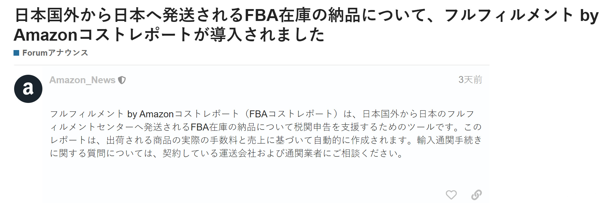 亚马逊日本站发布公告称FBA成本报告可帮助卖家为从日本境外运送到日本运营中心的亚马逊物流库存进行海关申报,以下是公告内容: