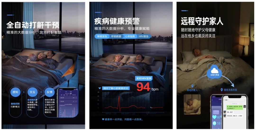 智能床的功能主要是辅助健康睡眠,其智能传感器可动态感知打鼾带来的振动信号,从而自动缓慢调节床头角度,改变体位达到止鼾效果。智能床可以每日形成睡眠分析报告,用户随时查看,分析,培养更好地睡眠习惯。还有推力闹钟功能,根据生活安排,设计出最适宜的睡眠时间,保障每天的固定休息时间,待时间到时床将自动抬起一定角度,将睡眠者推起床。