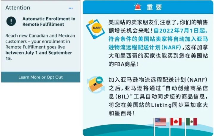 当然,这只是需要考虑的一部分问题,是否加入该项计划需要卖家多方了解,或者先取消加入,之后考察清楚再决定是否加入该计划,这个计划可能比较适合有想法在墨西哥与加拿大站点拓展的卖家去试水,但是对于没有这项计划的卖家来说,保守一点也没什么不好。如果想取消的话,需要在2022年7月1日前选择取消注册,不然就默认自动加入了。