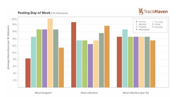 根据TrackMaven的研究,Instagram上最有效的发布日期分别是周五和周末两天。一天当中,美东时间下午五点左右发布的帖子能得到相对较高的曝光与活跃度。