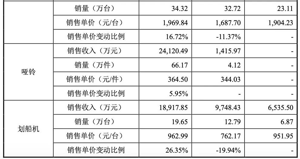 从销售数量来看,健身车每年销量超过100万台,椭圆机、跑步机每年是数十万台的级别,划船机是10万量台的级别。