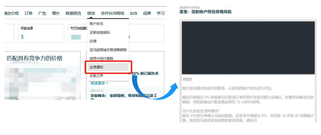 各位卖家可以通过查看“账户状况评级”和“业绩通知”来判断账户状况: