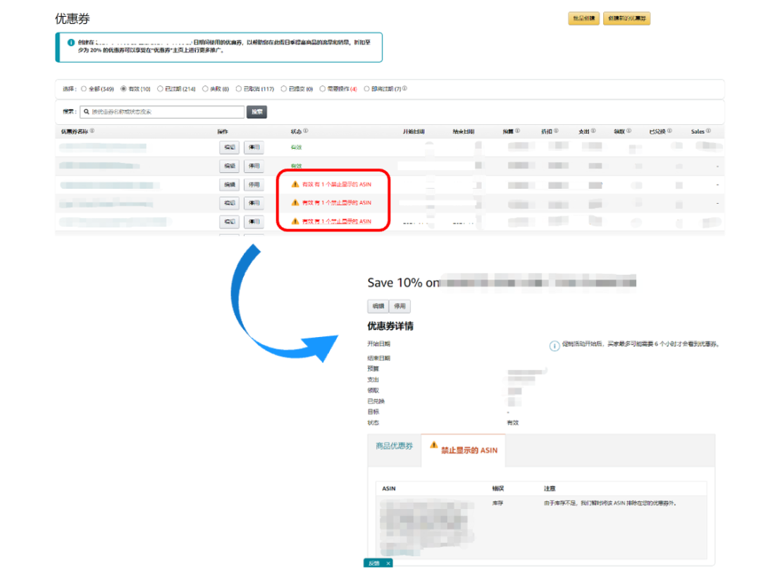 🔍 查看路径:卖家平台 > 广告 > 优惠券 > 对“状态”栏中显示红色字体的错误信息进行编辑或停用操作