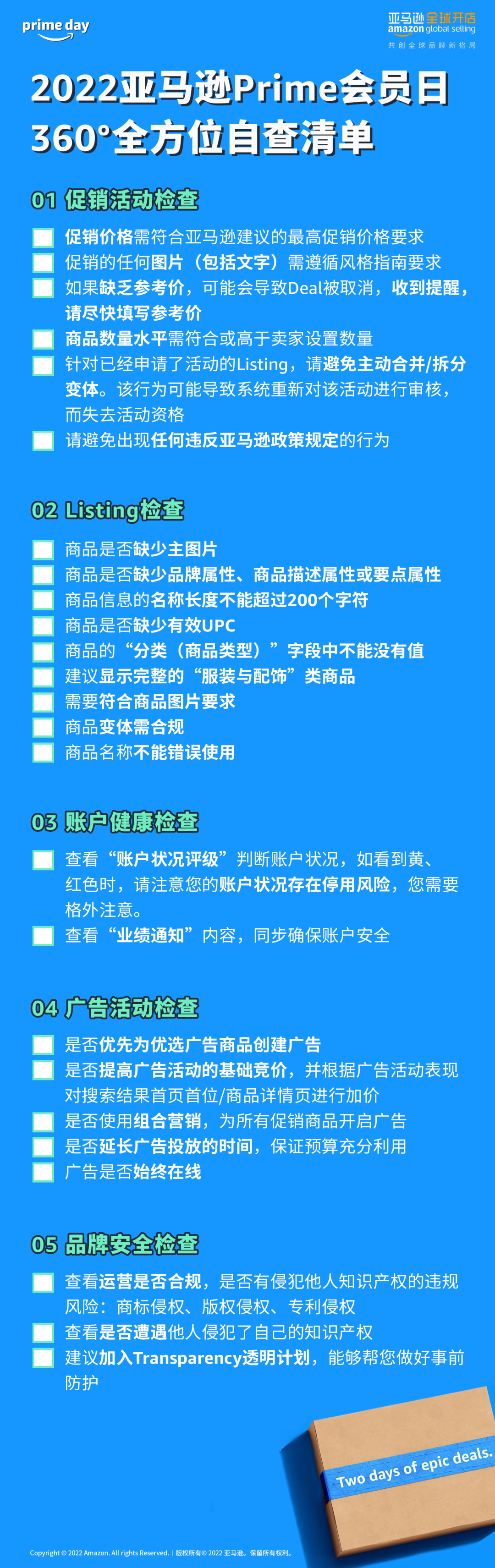 小编提醒:越到最后关头,越要稳下心态进行360°全方位大检查,确保之前付出的所有努力不会白费,万无一失迎接大促!在这里为各位卖家奉上一纸全方位大检查清单,请各位卖家认真比对清单,不遗漏任何环节,稳稳当当开启Prime会员日!