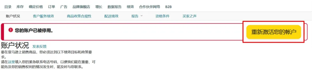 🔍 查看路径:通过卖家平台,点击红色警告卡下方的“重新激活您的账户”或进入“绩效 > 账户状况”页面,点击“重新激活您的账户”提交行动计划