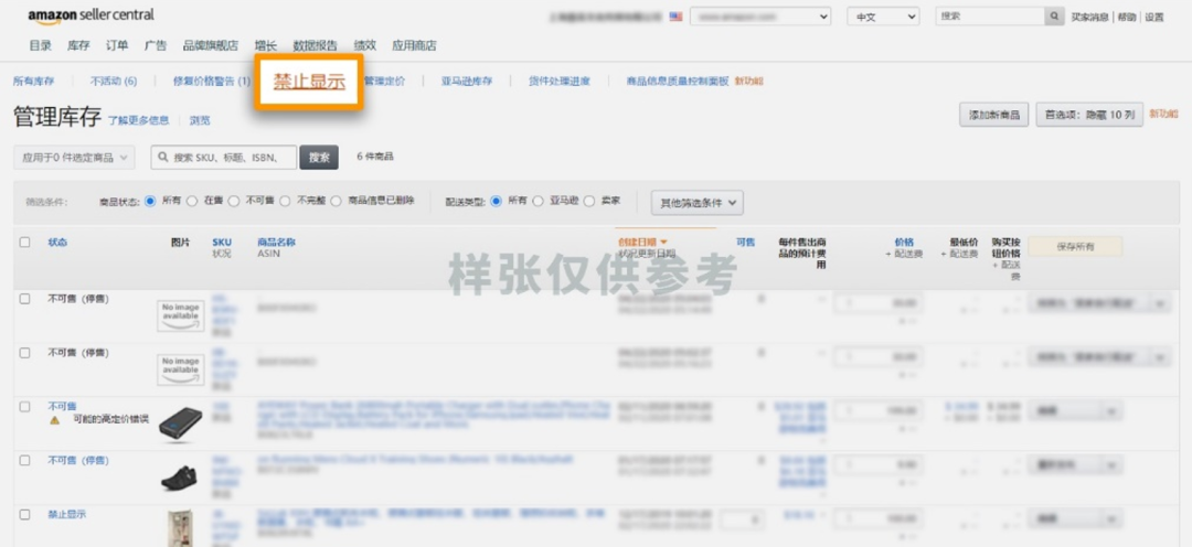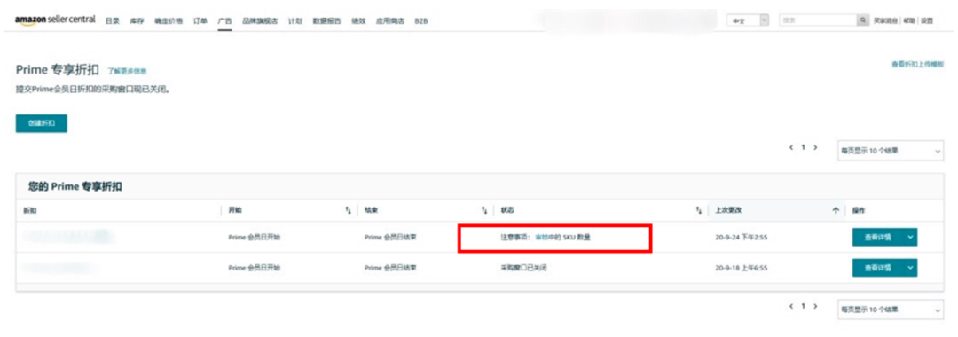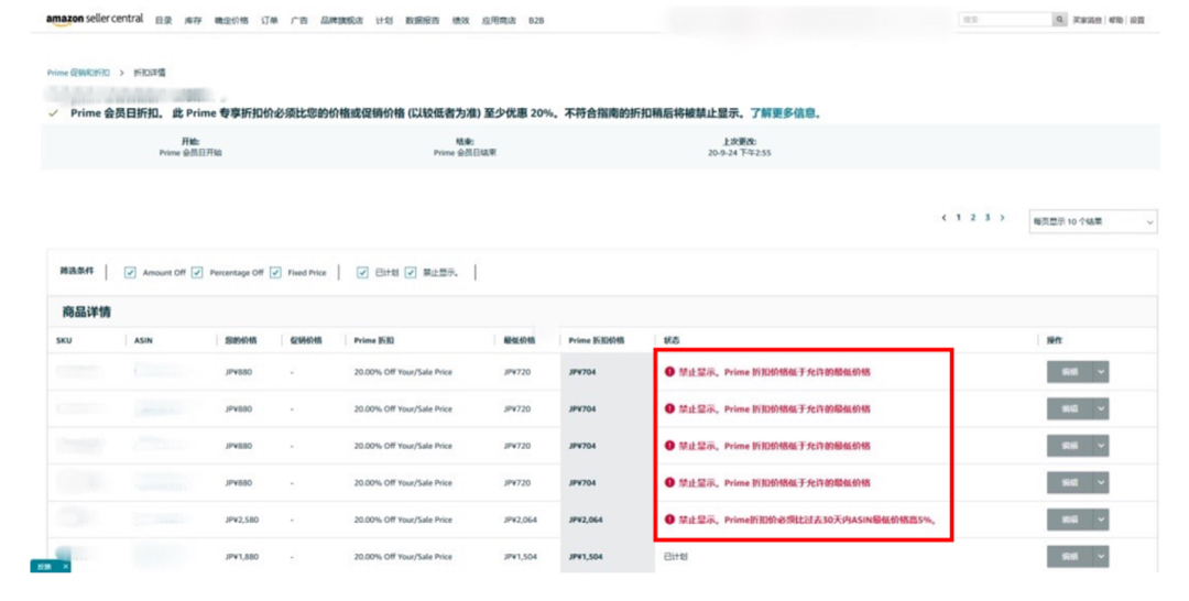 可在“状态”栏找到被禁止显示的Prime专享折扣及禁止显示的原因,根据提示原因编辑促销设置。(*注意,您的编辑将需要2小时来更新)