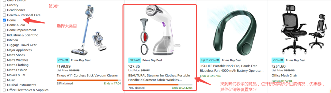 直接在亚马逊前台主页,点击prime day deals 选项卡,进入会员日大促界面,在界面最上方选择 “lighting deal ”按钮,然后点击最左侧的类目栏,选择你的类目。