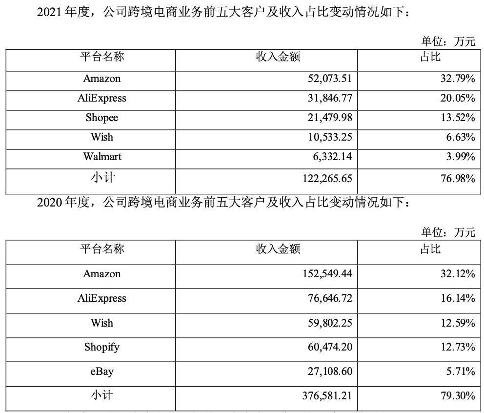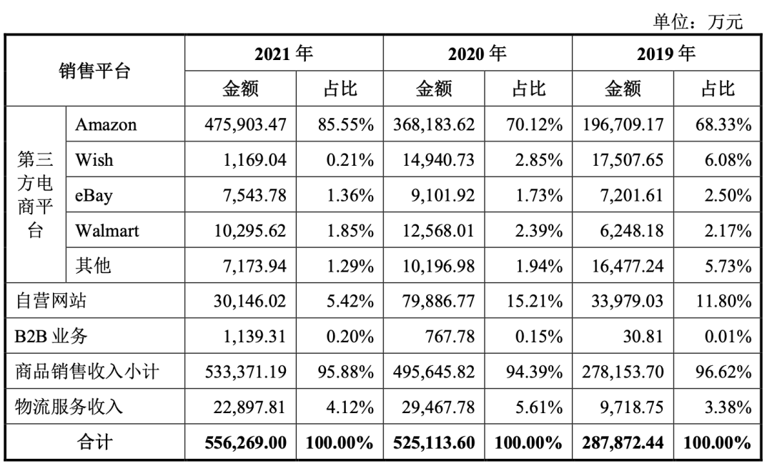 和赛维时代收入规模和经营模式非常相似的另一家来自深圳的大卖,易佰网络,我们也追踪了最近4年的数据。在2018年-2021年,公司通过亚马逊平台销售的销售额占比分别为41.09%、53.35%,61.30%和70.52%。最近一年大概是70%的收入占比来自亚马逊,而且从趋势来看也是逐年在增长。