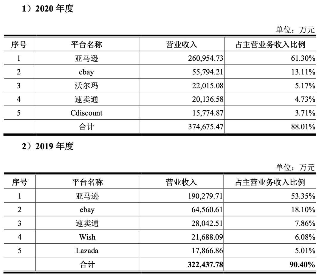 深圳跨境电商大卖家赛维时代最近刚刚在创业板过会,公司内亚马逊销售中心的员工人数,一直是公司内部占比最大的。追踪其过去5年的数据,在2017年、2018年、2019年和2020年上半年,公司通过亚马逊平台销售的销售额占比分别为53.92%、60.50%、70.12%及85.55%。最近三年,亚马逊平台对赛维时代的收入贡献越来越大。