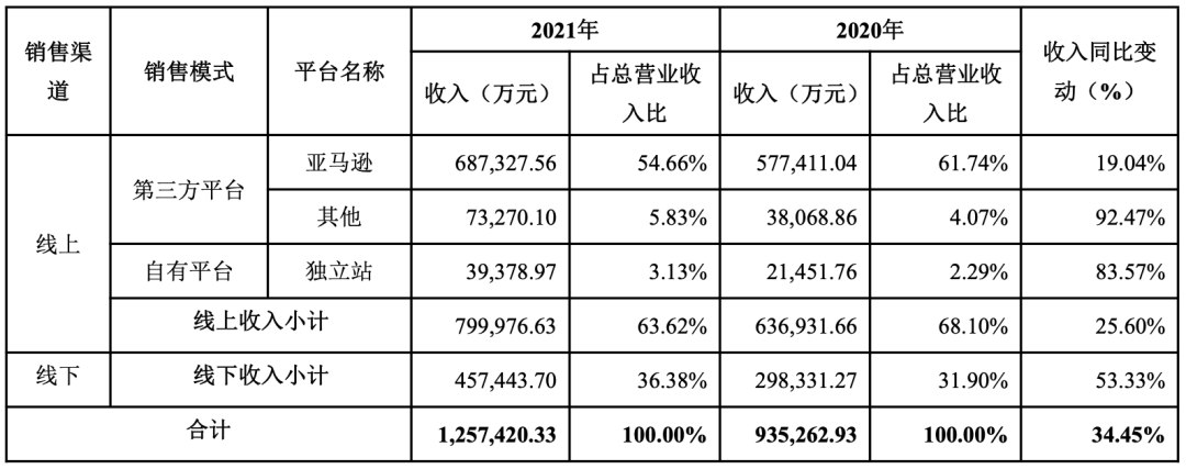 精品产品模式的代表,安克创新,在2017-2021年的五年之中,来自亚马逊平台的销售收入分别为286,353.42万元、367,563.97万元,440,902.70万元,577,411.04万元和687,327.56万元,占各期营业收入的比例分别为73.37%、70.25%、66.25%、61.74%和54.66%。虽然过往 几年Anker曾经超过70%的收入都来自亚马逊,也是亚马逊最具代表性的大卖之一,不过目前来看,亚马逊平台上的收入虽然仍在逐年上升,但在公司内部收入贡献是在逐年下降的。