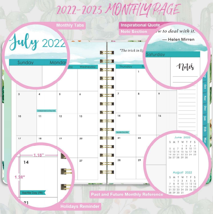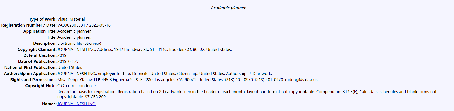 Journalinesh, Inc.在美国科罗拉多州成立,是一家著名的日记、学术计划和日历的设计师和制造商。自2020年以来,该公司一直在学术计划中使用绿松石色,用于标明月份和假期标签,还在整个月的每一页的标题上使用了受版权保护的艺术作品,在月指标页的右上角使用了励志名言。