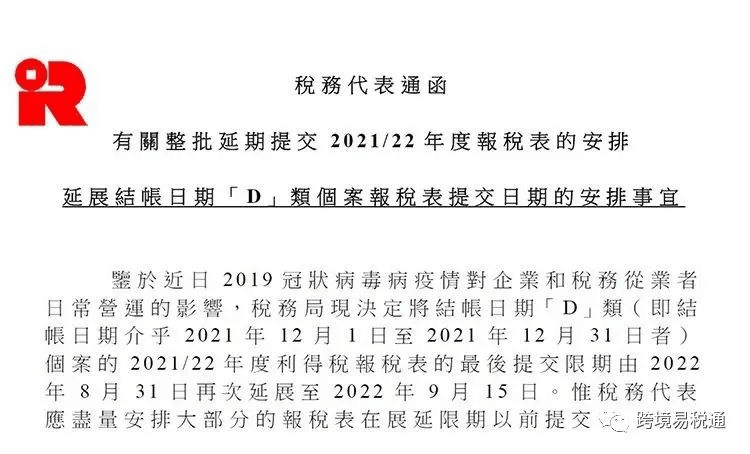 鉴于近日2019冠状病毒病疫情对企业和税务从业者日常营运的影响,税务局现决定将结帐日期「D」类(即结帐日期介乎2021年12月1日至2021年12月31日者)个案的2021/22年度利得税报税表的最后提交限期由2022年8月31日再次延展至2022年9月1 5日。惟税务代表应尽量安排大部分的报税表在展延限期以前提交。