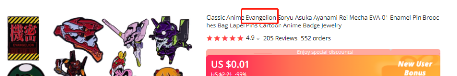 EVA是唤醒看过《新世纪福音战士》记忆的密码,但同时也是卖家不能使用的关键词。因为早在2005年,品牌方就注册了文字商标。所以一旦关键词中出现NEON GENESIS EVANGELION 或者 EVANGELION , 就会被认定为侵权!今年就有7起相关案件!