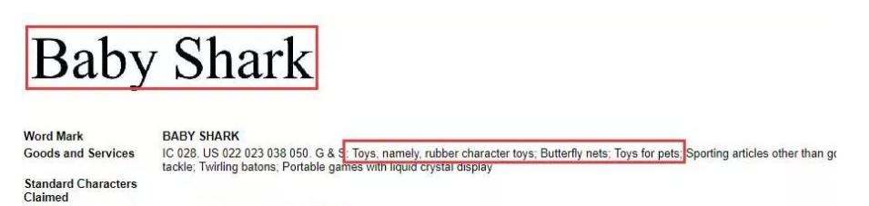 BABY SHARK注册的大类涵盖的范围很广泛,主要是玩具和其他周边产品。首先BABY SHARK字样是绝对不被允许出现在产品上,包括标题和产品本身。然后就是图片,即使是直接盗用官网的图片,也会被判定为侵权。最后就是卡通形象,鲨鱼宝宝们确实可爱,但是它们已经“名花有主”(被注册了版权),所以各位卖家只可“远观”。