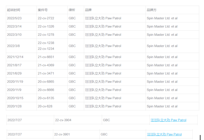 然而很多人都忽略了一个事实,《汪汪队立大功》不仅在受喜爱程度上和《小猪佩奇》相似,就连商标的注册方面,两部作品的步调也非常一致:所有的周边无论是玩具还是贴纸,只要是它的形象和带有Paw Patrol字样的都是侵权的。13起侵权起诉案件也足以说明品牌方的重视!