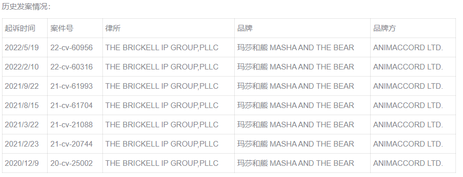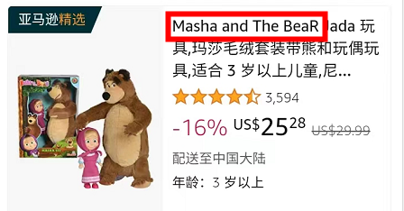 也正是因为动画足够有名,卖家才更需要注意。品牌方 ANIMACCORD 在2015年就注册了多个类目的美国商标,包括25类服装;28类玩具;30类糖果等。《玛莎和熊》的文字商标MASHA AND THE BEAR是不能直接出现在关键词中。由于版权限制,动画的卡通人物图案也不能随便使用。
