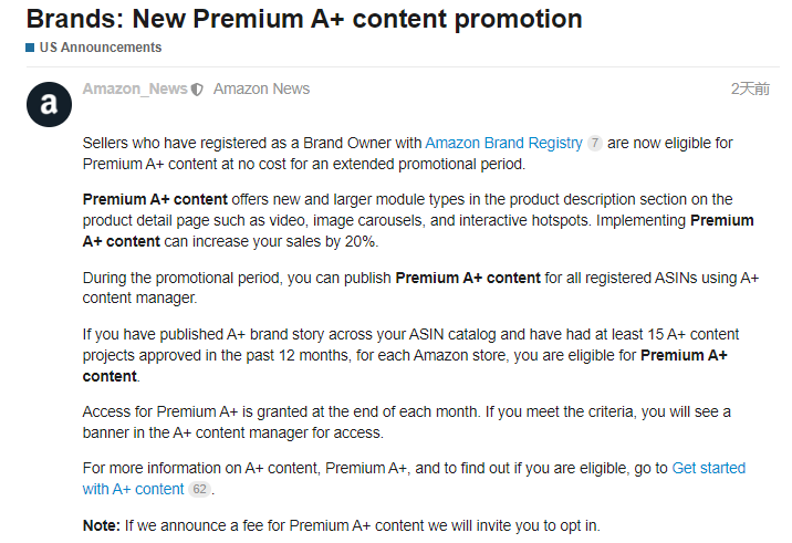 近日,亚马逊美国站发布了一则《Brands: New Premium A+ content promotion》的公告,公告显示品牌卖家现在有资格免费获得高级A+(Premium A+)功能。