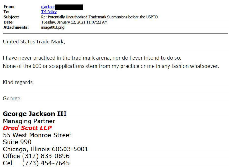 此外,该公司还委托了名为“Jackson George”的律师进行商标处理,提交了上千份商标申请。可是在USPTO查验后,又发现了可疑之处。虽然确实存在名为“Jackson George III”的美国律师,但是该律师已经向USPTO回应自己并未给任何商标领域申请提供代理服务。