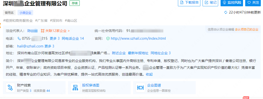 根据企查查给出的信息,这家深圳公司从事国内外商标注册、专利申请、版权登记,同时也为客户提供深圳 / 香港公司注册,银行开户、年审、做账审计;政府资助项目申报、企业资质认证、产品检测认证等一系列业务。