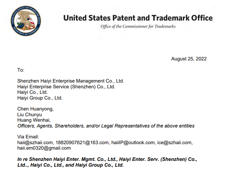 美国当地时间8月25日,美国商标专利局对深圳某公司发出《理由陈述令》,直指该深圳公司触犯法律法规,要求该深圳公司在9月初对在《理由陈述令》中提及到的多项疑问提供相应的实质证据。