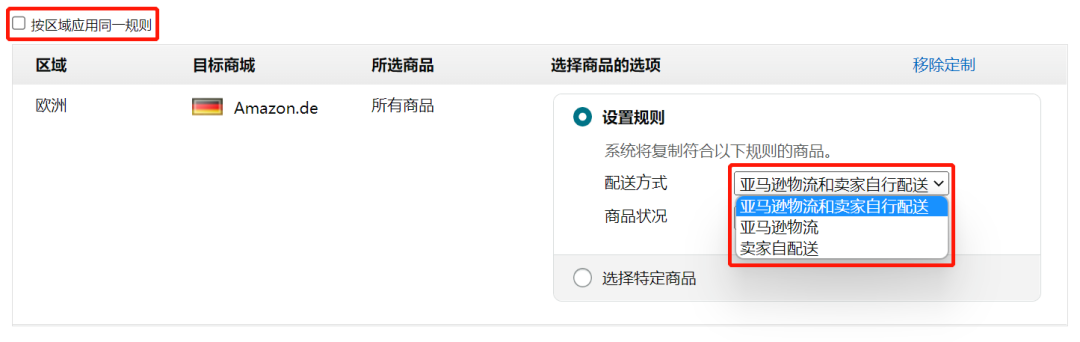④ 如适用,请选择“按区域应用相同的统一规则”,然后选择您想在其他商城中发布的商品类型,点击“保存并继续”;