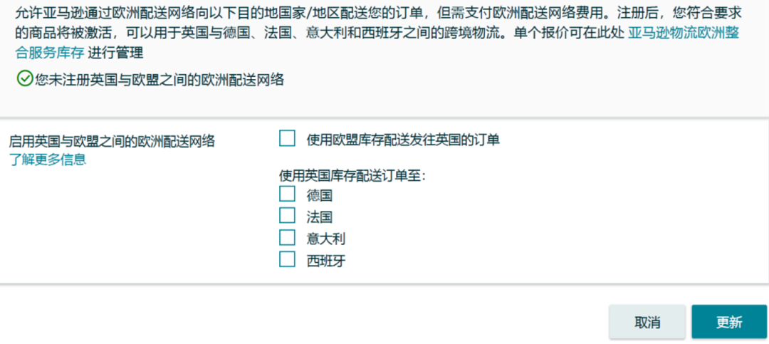 若您不想自动加入欧洲配送网络(EFN),您可通过在跨境物流设置的注册英国与欧盟(德国/法国/意大利/西班牙)之间的欧洲配送网络中选择完全或部分退出:
