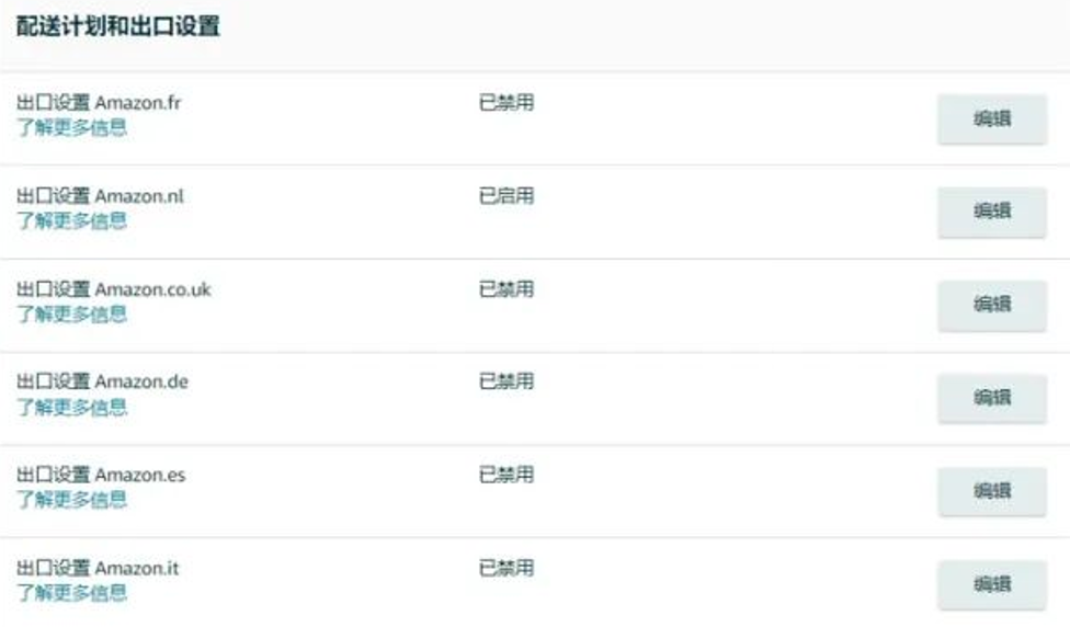您可点击“设置>亚马逊物流>跨境物流设置”, 激活您想要启用欧洲配送网络(EFN)的国家。