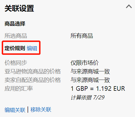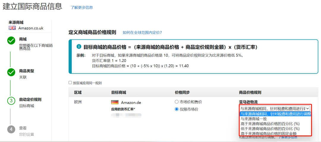 您可以通过:在【建立国际商品信息】页面右侧的关联设置,点击定价规则的“编辑”,在下拉菜单中选择“与来源站点相同,针对税费和费用进行调整”来启用这项自动定价规则。