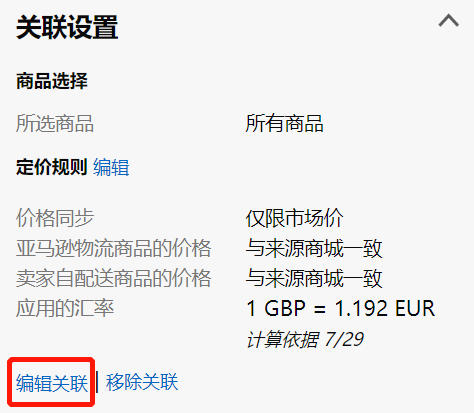 ② 选择目标商城,然后点击“关联设置”中的“编辑关联”;