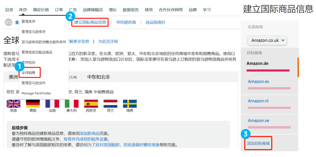 ① 在卖家平台,点击“库存>全球销售>建立国际商品信息”,如果您尚未添加所需的全部商城,请单击“添加目标商城”,添加所需商城,如果您已完成此操作,请直接转到下方③;