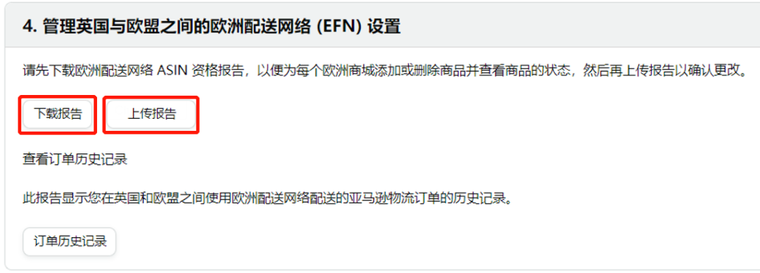 您可以通过点击“库存>亚马逊物流欧洲整合服务库存>report> 4. 管理英国与欧盟之间的欧洲配送网络(EFN)设置”下载ASIN资格报告,以便为每个欧洲商城添加或删除商品并查看商品的状态,然后再上传报告以确认更改。