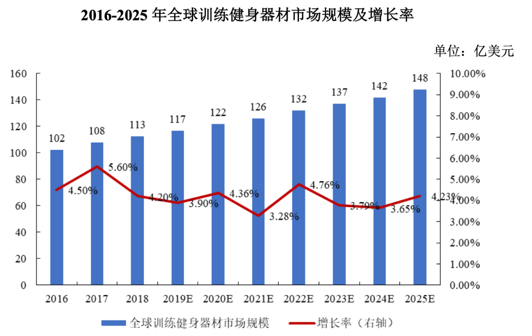 健身用品在欧美有非常广泛的消费基础。根据前瞻产业研究院整理和公布的数据显示,2016-2018 年全球训练健身器材市场规模整体呈现上升趋势,预计到2025年全球训练健身器材市场规模为148亿美元,较 2016 年增长44.67%。