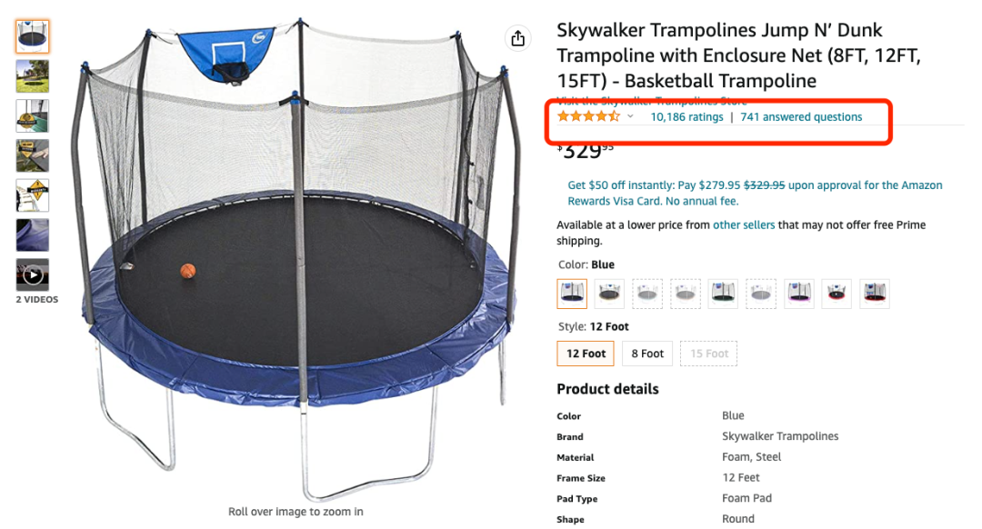 在亚马逊上,Skywalker品牌的蹦床产品是畅销单品,一些热门listing累计评论上万个,一般竞争对手都很难抗衡。
