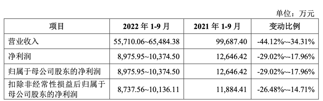 2022年前三季度,公司预计营业收入为5.57亿元-6.55亿元,同比下降34.31%-44.12%,预计净利润为8,975.95万元-10,374.50万元,同比下降17.96%-29.02%。