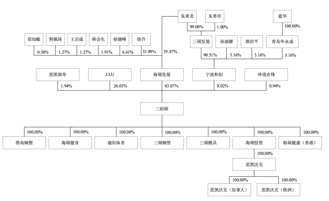 三柏硕健康科技可算是ODM及品牌双模式发展的健身器材企业代表。其前身为海硕钢塑,设立于2004年6月。2020年12月,公司整体变更方式设立股份有限公司。截至招股书发布日,公司拥有10家全资子公司,其中7家一级子公司,1家二级子公司,2家三级子公司,无参股公司及分公司。