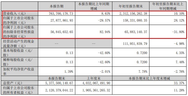 其中,第三季度,该公司实现营业收入达7.64亿元,同比增长8..63%;归属于上市公司股东的净利润为2787.8亿元,同比下降 29.57%;扣非后净利润为5684.6亿元,同比增长82.94%。
