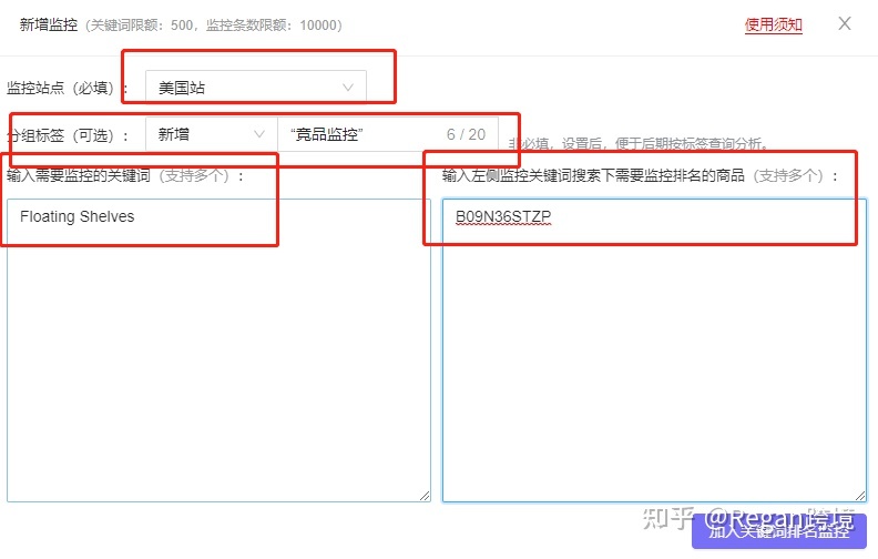 然后添加我们的自身asin或者竞品asin,以及想要监控的关键词: