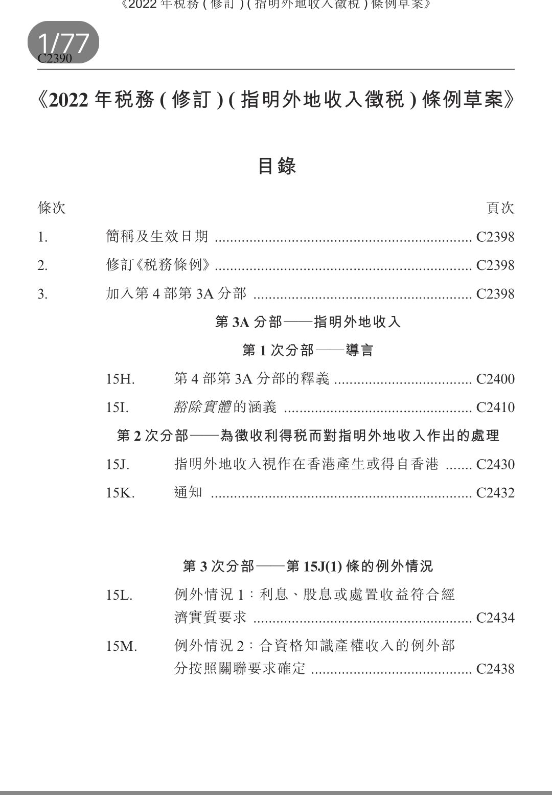 香港政府于2022年10月28日在宪报中正式发布《2022年税务(修订)(指明外地收入征税)条例草案》(以下简称“条例草案”),明确离岸豁免制度的最新规则。条例草案已提交立法会,并于2022年11月2日由立法会审议。