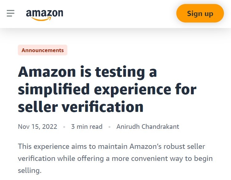 亚马逊卖家注册服务总监Anirudh Chandrakant表示,“我们的测试将确定我们是否能够实现与当前流程相同的身份验证稳健性,同时为选择此验证流程的卖家提供更好的体验。”