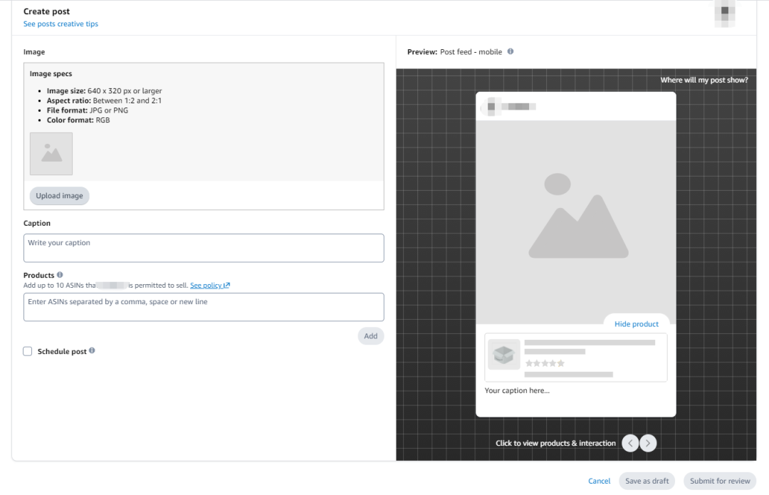Products:可以输入asin,一个帖子可以输入10个asin。建议畅销的先放前面,价格优势的也可以放前面。投放的asin也可以是同个品牌下的互补或者互替的产品,若卖家的店铺产品较少,想要获得更高的流量和曝光,也可以投放竞品的asin(互补或者互替的竞品asin都可),帮助自己的post获得更多的分类标签从而获得更多的曝光。