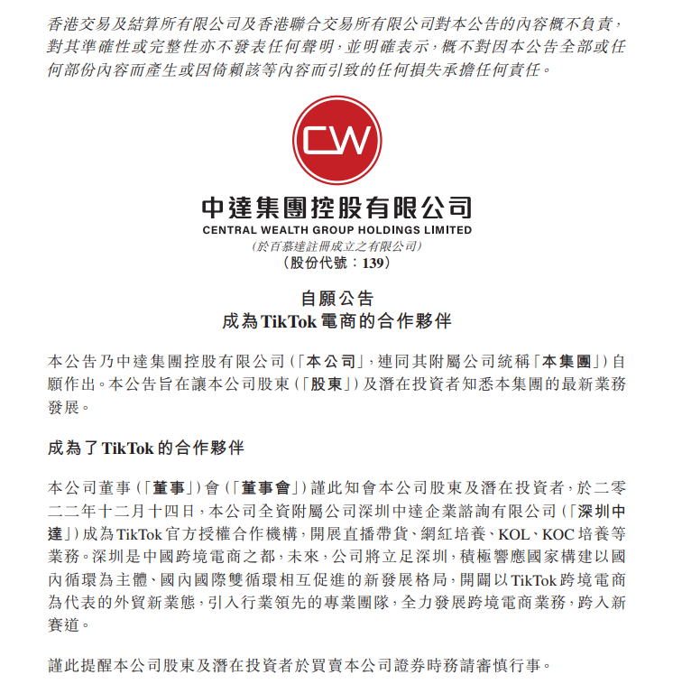 中达集团控股发布公告称,于2022年12月14日,公司全资附属公司深圳中达企业咨询有限公司(深圳中达)成为TikTok 官方授权合作机构,开展直播带货、网红培养、KOL、KOC 培养等业务。
