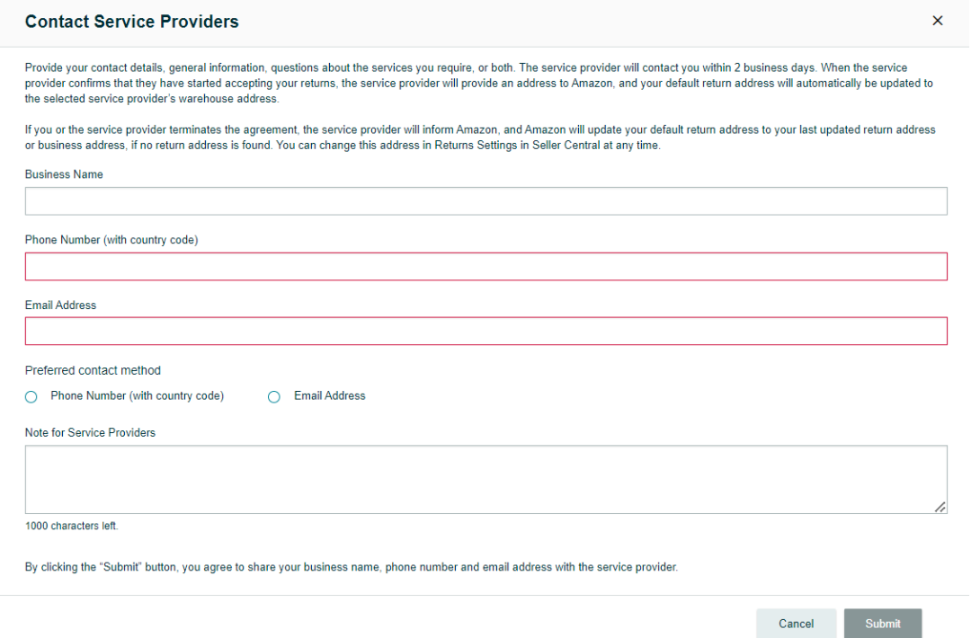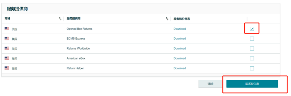 您可以查看相关信息,并通过【联系提供商】按钮选择符合您的退货服务需要的服务提供商。这将让您与该服务提供商建立沟通。