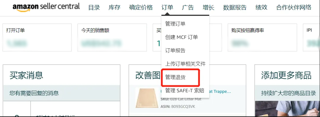 登录卖家平台,选择【订单】,然后点击【管理退货】。