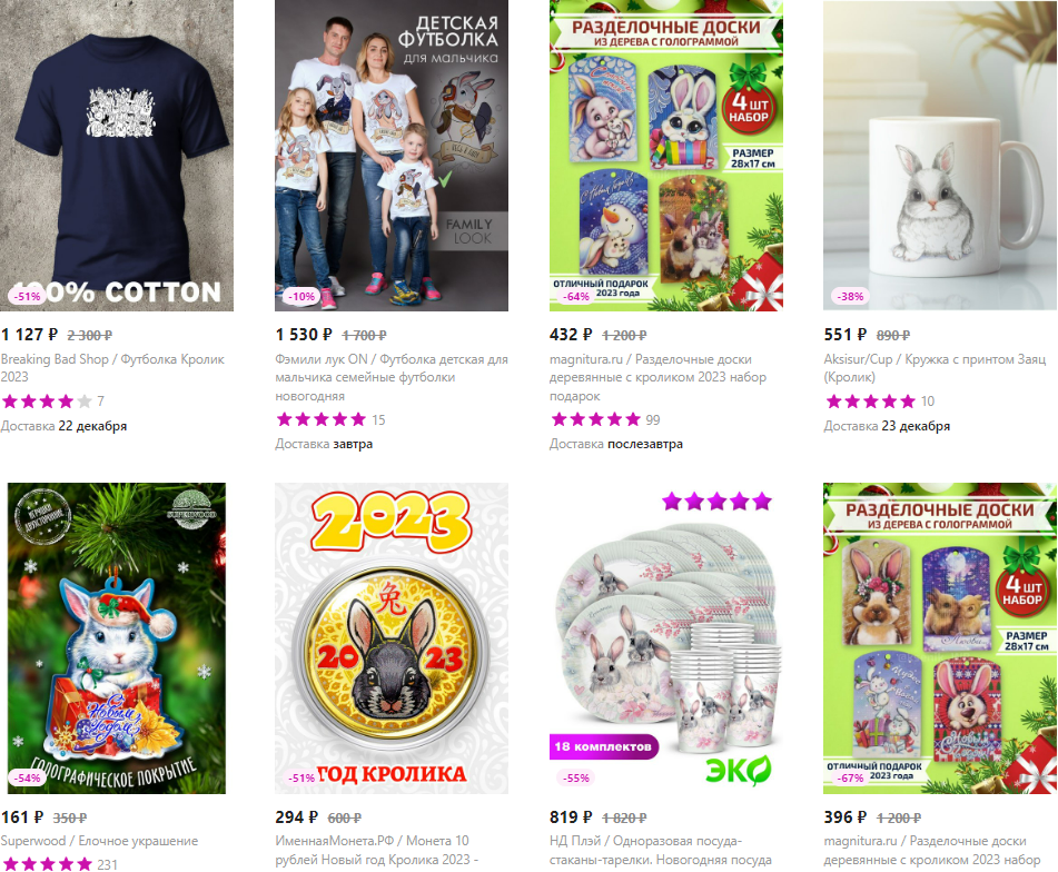 根据Wildberries的调查,新年前夕,俄罗斯人正忙着购买象征2023年的各种纪念品和礼物。在2022年12月1日至12月14日期间,猫兔图案产品的销售额超过老虎图案产品的151%。