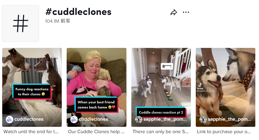 在TikTok上有一位博主@cuddleclones拥有38万粉丝,点赞高达上百万,在该博主的账号主页中大部分更新的内容都是铲屎官们收到克隆爱宠玩偶之后的反应,还有一部分视频是测试宠物看到玩偶的有趣反应,这也从侧面表明定制出来的玩偶还原度极高。