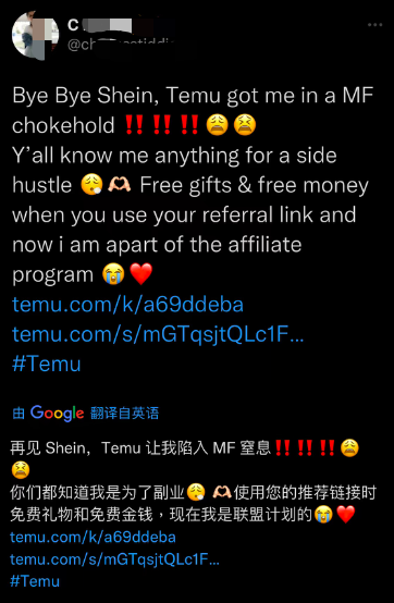还有特别忠诚的联盟博主,发了大量Temu的帖子,甚至还一边推Temu,一边说“要跟Shein拜拜”。从这个角度来看,Temu的出现,是真的动了Shein的蛋糕了。