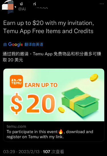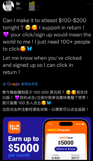根据美国当地的实际情况,Temu的传播方式做了改良,主要针对一些想做“网赚”的群体,让他们加入Temu的联盟计划,消费者通过联盟计划产生的链接点击注册,就能为“网赚”玩家获得佣金。