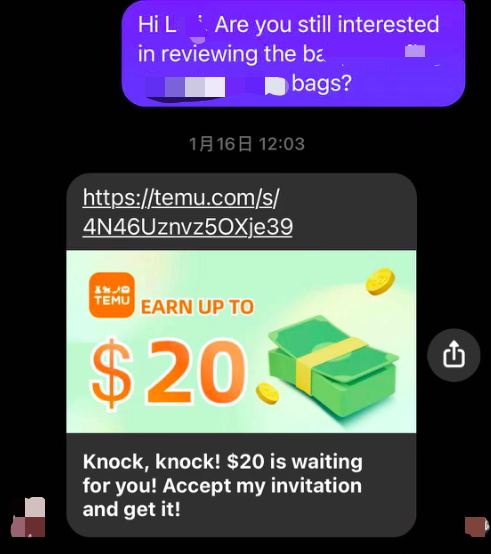 参与Temu联盟的人,从社交媒体的profile来看,各种各样都有。更让人惊讶的是,有亚马逊卖家最近找过往的Reviewer帮忙上评的时候,对方好久不回复,随后就发过来一个Temu链接,希望卖家能点击注册。